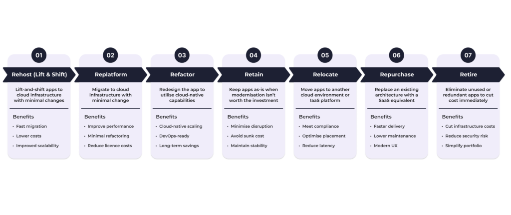 So, what exactly are the 7Rs and how do they help reduce cost through modernisation? Let’s break it down. Developed by AWS, the 7Rs framework is a practical tool we use to classify each application based on its business value, technical complexity, and modernisation potential. By mapping apps to one of the seven strategies, we help organisations make informed, cost-conscious decisions that avoid overengineering and accelerate time to value.